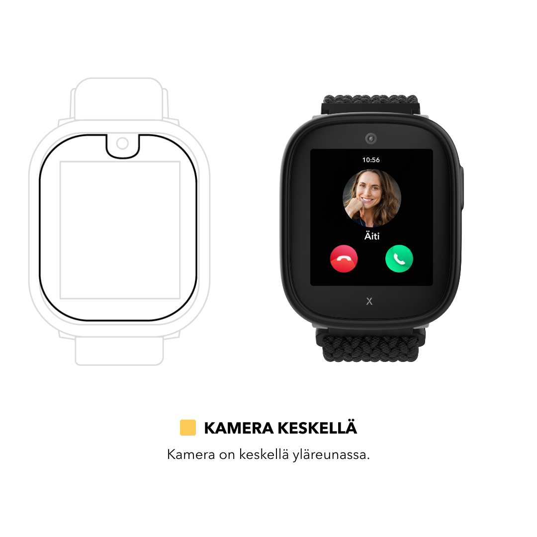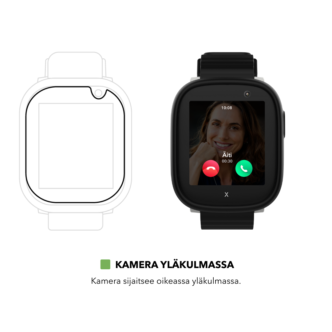 - Kamera yläkulmassa – malleille, jossa kellopuhelimen etukamera on sijoitettu näytön oikeaan yläkulmaan.