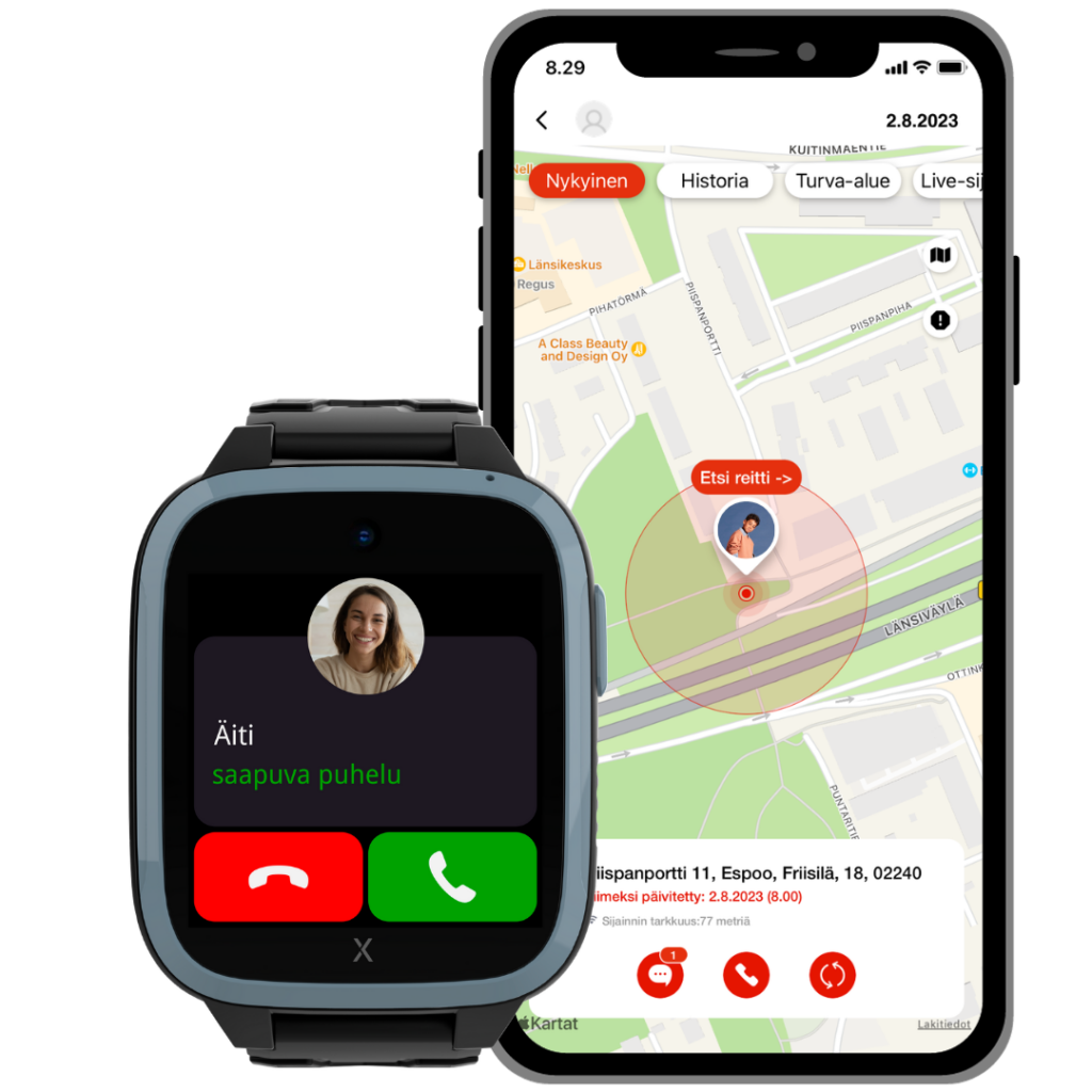 Katso, missä lapsesi liikkuu XGO3-kellopuhelimen avulla. GPS-toiminnon avulla voit seurata lastasi, kun hän on ulkona leikkimässä. Matkapuhelimeen ladattavalla huoltajan sovelluksella voit myös luoda turva-alueita. Saat sovellukseen ilmoituksen, kun lapsi saapuu tai poistuu turva-alueelta.