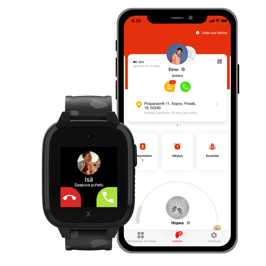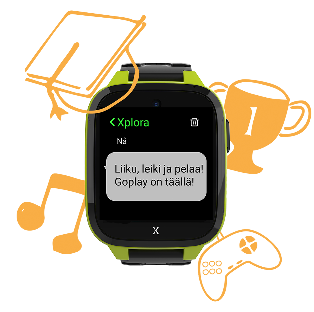 Pitämällä kellon virtapainiketta pohjassa vähintään 10 sekunnin ajan, kello soittaa automaattisesti huoltajalle. Tämän lisäksi kello lähettää push-ilmoituksen toiselle huoltajalle, jos sellainen on määritelty Xplora -sovelluksessa.