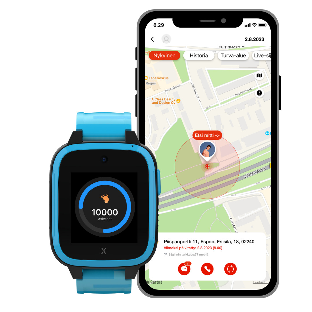 Katso, missä lapsesi liikkuu XGO3-kellopuhelimen avulla. GPS-toiminnon avulla voit seurata lastasi, kun hän on ulkona leikkimässä. Matkapuhelimeen ladattavalla huoltajan sovelluksella voit myös luoda turva-alueita. Saat sovellukseen ilmoituksen, kun lapsi saapuu tai poistuu turva-alueelta.