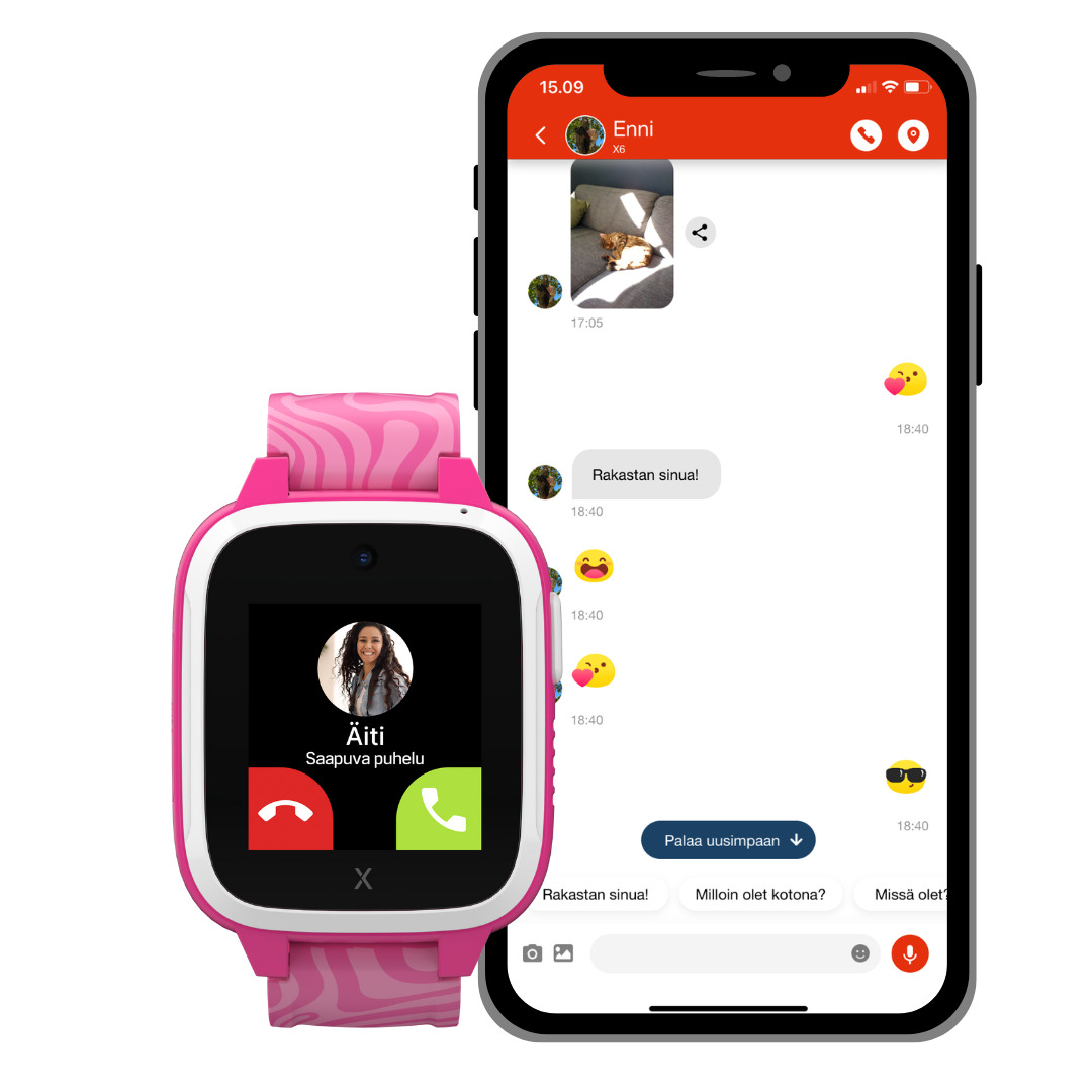 Kelloon esiasennettu Xplora Mobilen SIM-kortti mahdollistaa puhelujen soittamisen ja vastaanottamisen aivan kuten tavallisella matkapuhelimella. Tällä tavoin voit pitää helposti yhteyttä lapseen. Huoltajan sovelluksessa voit itse määrittää yhteystiedot, joiden kanssa lapsi voi olla yhteydessä. Lapsi voi myös itse lähettää valmiiksi asennettuja viestejä, emojeja sekä ääniviestejä huoltajan sovellukseen – ei tylsää tekstiviestiä!